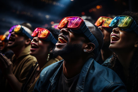 Virtual Concert Experience: Fans wearing VR headsets, attending a virtual concert, capturing the energy and excitement of live performances in a virtual space.