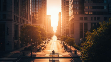 A city street is shown with tall buildings lining both sides. The scene features a solitary figure on a bench, bathed in warm sunlight. The composition emphasizes depth, with a focus on color and light. Suitable for use in a variety of visual projects.