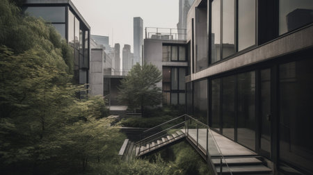 This captivating urban landscape showcases the blend of modern architecture and lush greenery, featuring glass buildings reflecting nature. The scene highlights the harmony between urban life and the environment, demonstrating the importance of integrating green spaces in city design.
