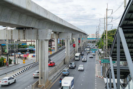 BTS Srinagarindra Station, Samut Prakan,Thailand-December 29.2021.Overhead view. There is relatively few amount of vehicles on the road below. And skytrain platform.