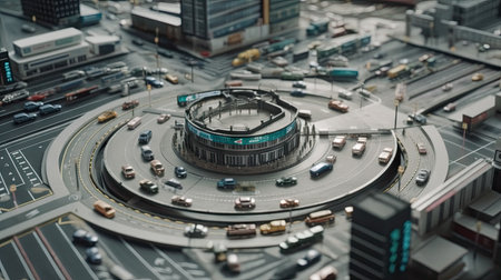 City of the Near Future with a Large Amount of Ground Transportation on the Road. A futuristic city with lots of vehicles.