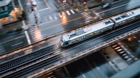 Capture the essence of a modern train moving along elevated tracks in a rainy urban setting, showcasing the vibrant city lights and reflective surfaces.