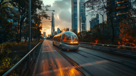 Electric cars in futuristic city. Autonomous capsules transport passengers along an urban street surrounded by high-rise buildings and parks.