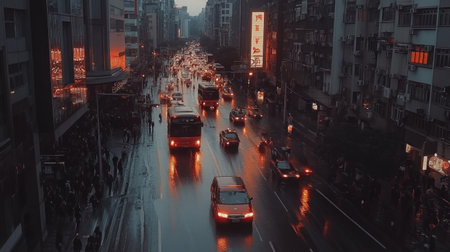 A vibrant urban street scene showcasing heavy traffic during a rainy evening. Bright lights reflect on wet roads, illustrating the bustling city atmosphere.