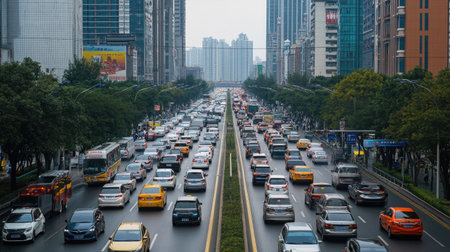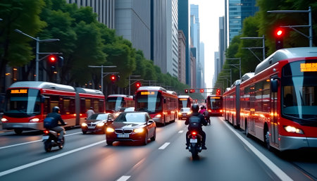 A bustling city street scene with modern red buses, cars, and motorcycles stopped at traffic lights in a vibrant urban environment. Tall buildings line the busy metropolitan road.