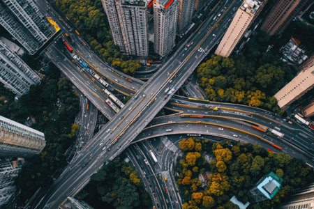 Aerial Top View of Epic City Highway Car Traffic System. Busy Road Junction Street Route Vehicle Motion Overview. Business District Transport Development Travel Concept. Drone Flight Shot