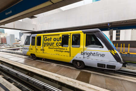 Miami, FL, USA - April 19, 2019: Metromover in Downtown Miami. Metromover is a free public transit automated people mover train system operated by Miami-Dade in Miami, FL, USA.