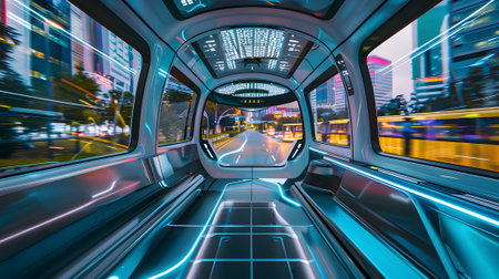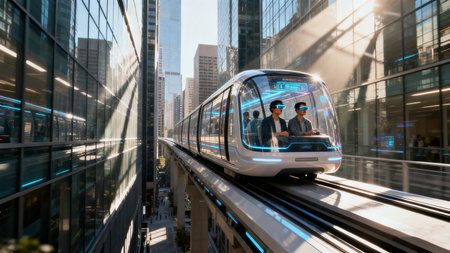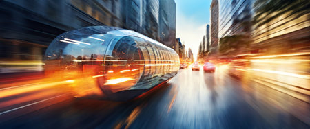 A futuristic transit vehicle travels through a vibrant city center surrounded by skyscrapers.