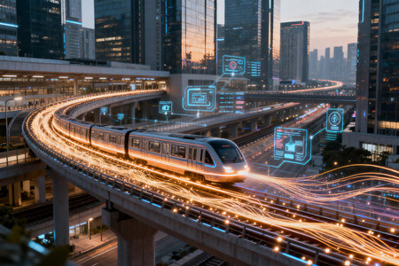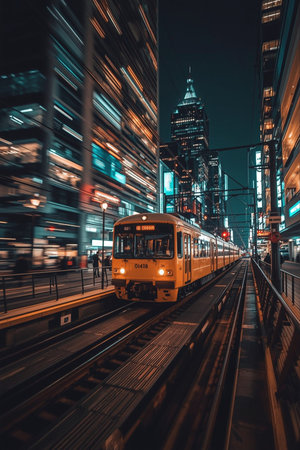Dynamic cityscape featuring a glowing yellow train approaching on elevated rails, framed by neon-lit skyscrapers. Perfect for modern transportation, urban design, and futuristic themes.