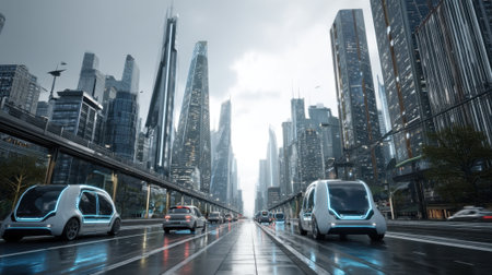 Autonomous vehicles move along the road in a modern city. Tall buildings line the streets under a cloudy sky. The atmosphere is busy with traffic and activity.
