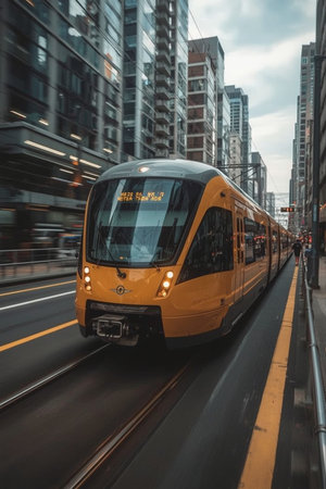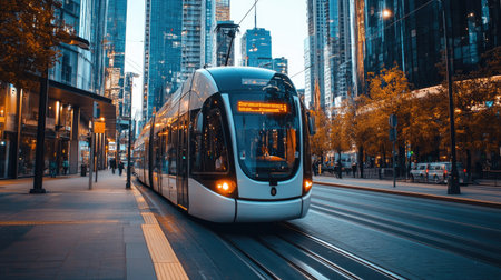 Modern, High-Speed Tram in Urban Environment, Public Transportation, Sustainable City Infrastructure