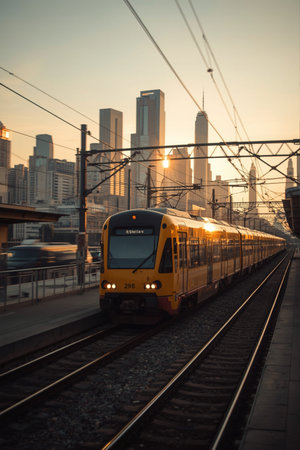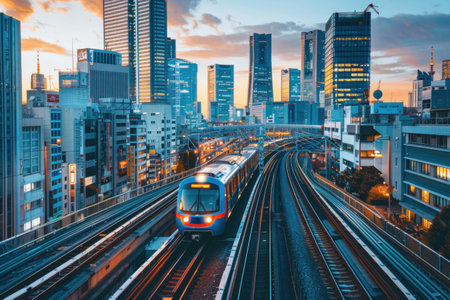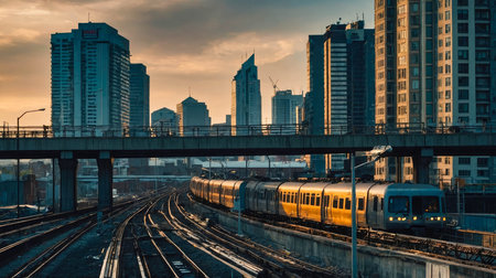 Striking urban scene of a modern electric train moving along tracks with skyscrapers in the background during sunset.
