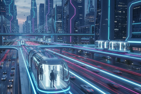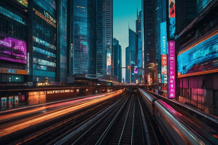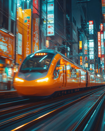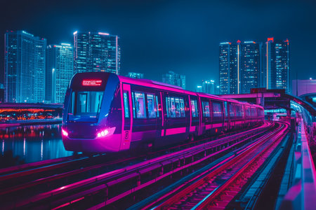 Neon lit city modern trains showcase advanced technology and vibrant urban nightlife