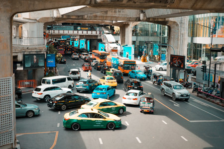 Traffic on crossroad on street. From above modern cars and motorcycles driving on intersection on street in center of Bangkok, Thailand.