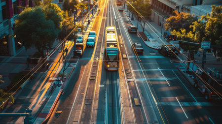 A bustling city scene showcasing a modern transport system with trams and vehicles in motion during twilight.