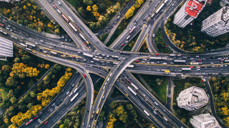 Aerial view of a bustling motorway, with cars and trucks moving swiftly along multiple lanes, surrounded by green landscapes and urban buildings.