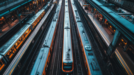 An overhead view of a busy train station with trains arriving and departing on multiple tracks, capturing the hustle and bustle of daily commuter life.