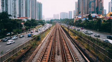 A captivating view of urban infrastructure featuring railway tracks and a busy highway, showcasing the interaction between modern architecture and nature.