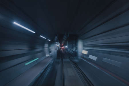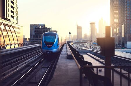 Subway train at sunset in modern city. Dubai metro. Downtown skyline with sundown. Skyscraper buildings and car traffic in the highway. Futuristic public transportation system.
