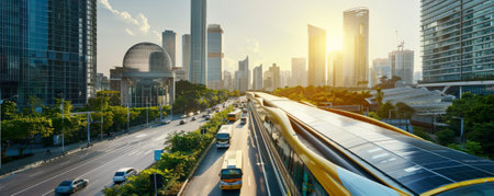 A modern cityscape with solar-powered buildings and eco-friendly transportation.