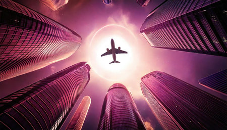 A vibrant urban scene captures a modern railway train approaching a station amidst tall skyscrapers, showcasing the dynamic life of city transportation.