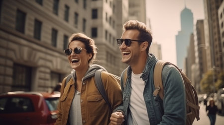 Couple of tourists walking in New York City, wearing sunglasses.