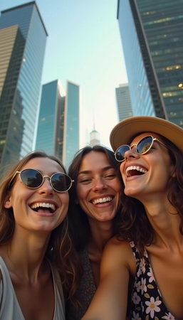 Three friends enjoy the vibrant atmosphere of the city, sharing laughter and joy as they pose together against a backdrop of stunning skyscrapers under bright sunlight.