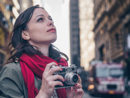 Young girl with a retro photo camera on the street in New York