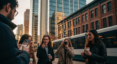 City commuters photographing skyscrapers with smart phones at rush hour generated by artificial intelligence