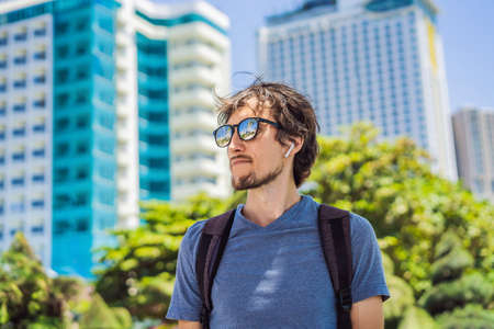 Man traveler makes a photo on your smartphone on a city street. The concept of connection and communication in the journey.