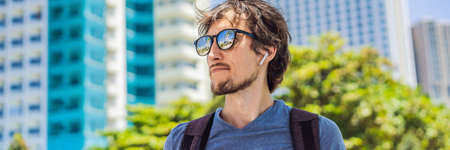 Young man listening to music on a city street BANNER, LONG FORMAT