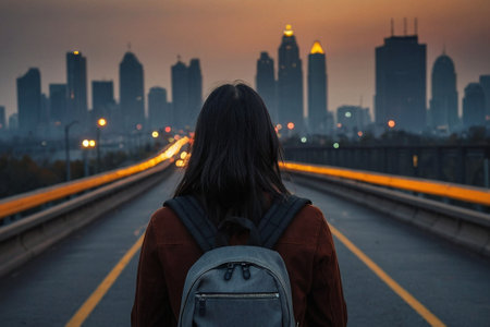 Young woman with backpack walking on the bridge and looking at the sunset