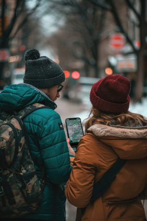 Two people are standing on a snowy street, one of them holding a cell phone. They are both wearing winter hats and backpacks