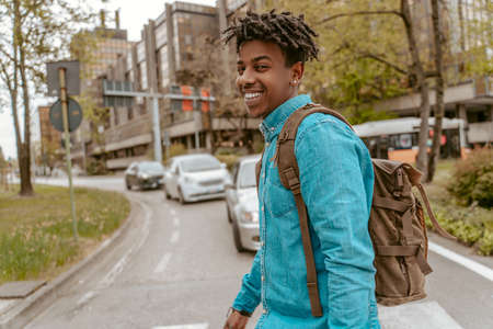 Guy smiling at camera crossing road in city