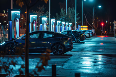 Row of Teslas are parked at a charging station. The cars are all black and are parked in a row. The scene is set at night, with the street lights illuminating the area