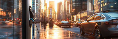 Electric cars are plugged into a modern charging station on a busy urban street as sunlight casts a warm glow over the scene.