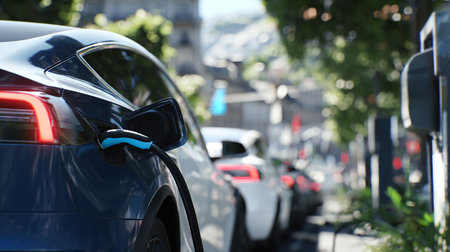 Electric vehicle charging at EV charger station in urban setting