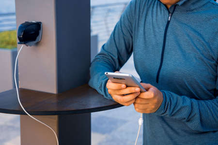 Close-up of unrecognizable black man plugging phone charger into socket on ground outdoors