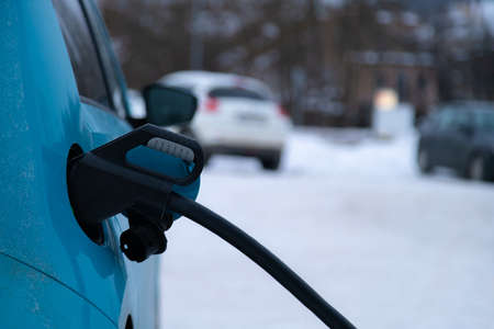 Charger plug inserted in electric car on snowy winter background. Green energy.