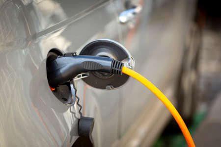 Color image with a plug charging an electrical car.
