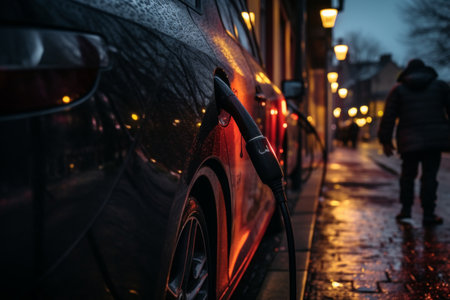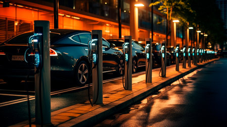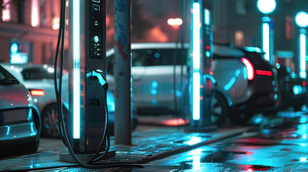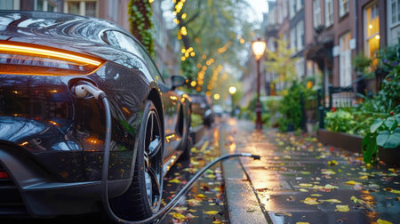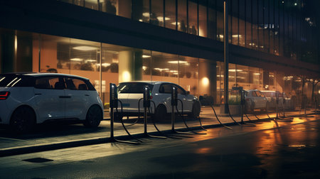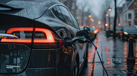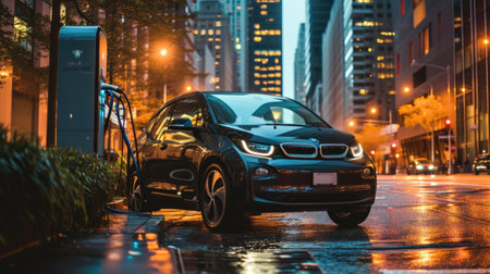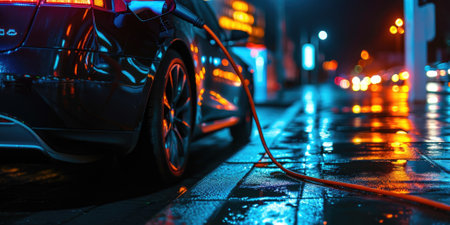 Electric car charging on rainy urban street at night. concept of sustainable transport, urban innovation, eco-friendly technology.