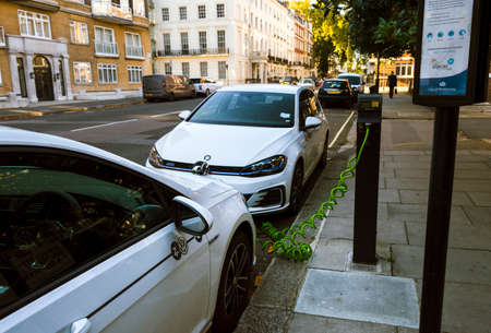 London/UK-30/07/18: white Volkswagen Golf GTE cars charging at a charging point on a street in London. The Golf GTE is a plug-in hybrid version of the Golf hatchback