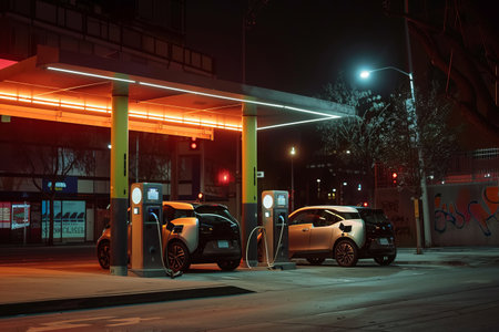 Modern electric vehicle charging station illuminated with neon lights, two cars charging at night