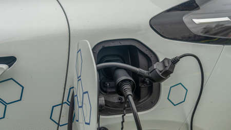 Close-up view of power supply plugged into an electric car being charged. Electric car charging. Back side of the car loading energy.