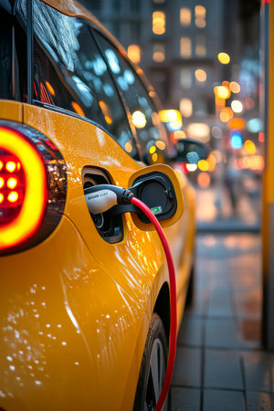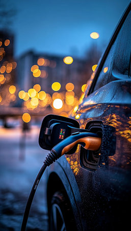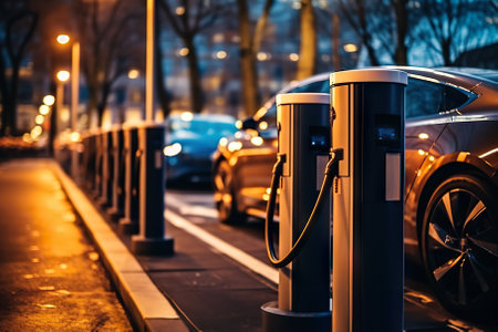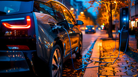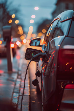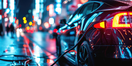 Electric car charging in urban setting at night with blurred city lights creating a vibrant atmosphere electric mobility concept.