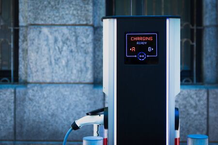 Power supply for electric car charging. Electric car charging station. Blurred concept
