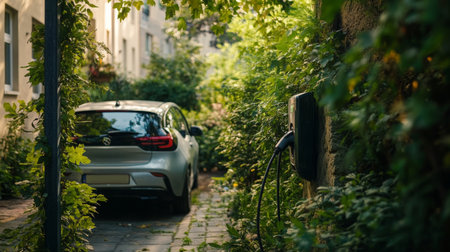 Electric vehicle charging in a lush garden setting during daylight hours in an urban area