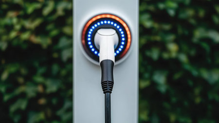 Close-up view of an electric vehicle charging station featuring a plug and LED indicator lights, set against a lush green background, showcasing technology and sustainability.