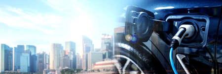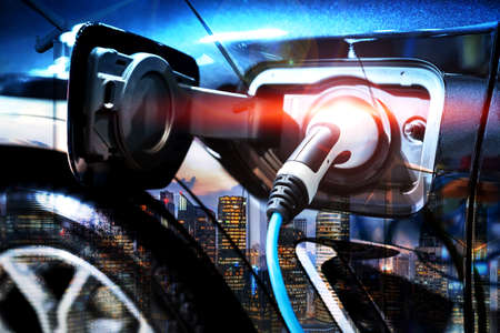 EV charger or electronic vehicle charger that have charging cable in plug socket and recharging power to lithium ion battery in hybrid automobile which represent future of transportation and green energy
