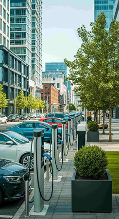 This compelling highlights the forward-thinking approach to urban mobility. The image showcases a row of state-of-the-art fast electric vehicle chargers, seamlessly charging cars in a park, revolutionizing the way we power our vehicles and reducing our carbon footprint.